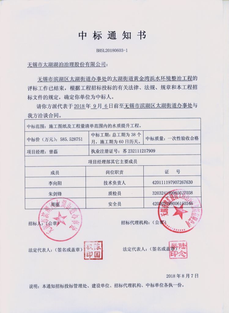 8月7日,安博官方网页版_安博(中国)在太湖街道黄金湾浜水环境整治工程投标阶段,凭借良好的市场信誉,成熟完善的投标方案,从众多竞争对手中脱颖而出,成功中标该项目,中标价585万元。